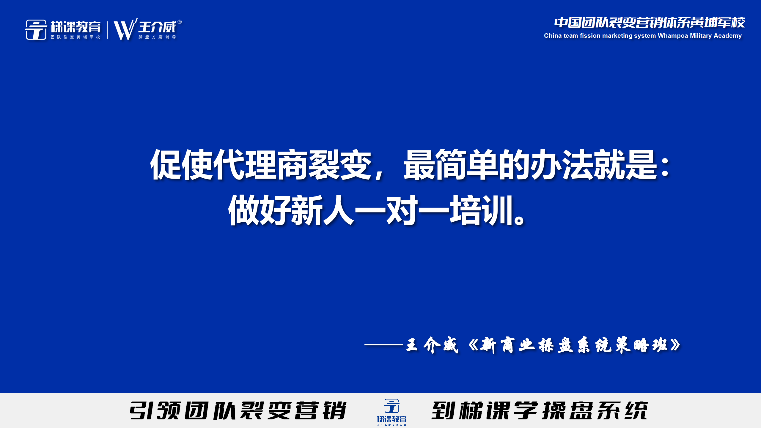 很多企业的第一个误区,就是把培训的责任全揽在公司身上。王介威老师强调:新人代理的第一任培训师,必须是他的“老大”(老代理商)。