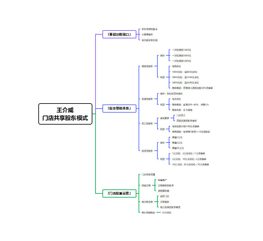 消费型股东是门店流量的核心基石,其设计逻辑是通过低门槛准入与阶梯化权益,锁定高价值客户,实现“消费即绑定、分享即收益”。王介威老师指出,这类股东的核心作用的是激活存量客户粘性,同时借助社交裂变带来增量客源。